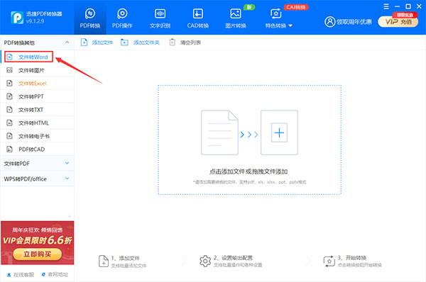 1、打开转换功能我们打开迅捷PDF转换器软件,通过点击「PDF转换」-「PDF转其他」-「文件转Word」按钮,即可进入转换界面。