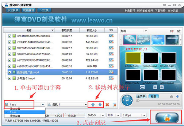 5、回到刻录工具的主页面中可以在底部选择【添加字幕】,然后将ass等格式的字幕文件添加进来,就可以为选中的视频添加字幕,还可以点击↑或者是↓按钮来移动视频的播放顺序哦,还可以选择视频输出的尺寸比例等。