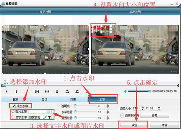 4、切换到刻录工具的【水印】,选择添加水印,再选择添加文字水印还是图片水印,只能选择文字或者是图片二选一。然后可以在上方的输出视图中来调整水印的显示位置以及显示大小等,设置完成点击【确定】保存。