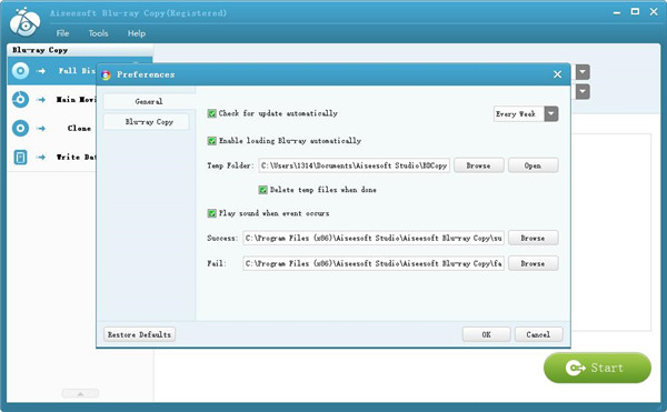 5、配置程序首选项,可以修改默认临时文件夹,请求Aiseesoft Blu-ray Copy在复