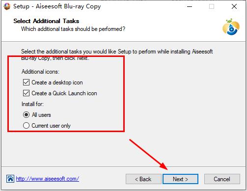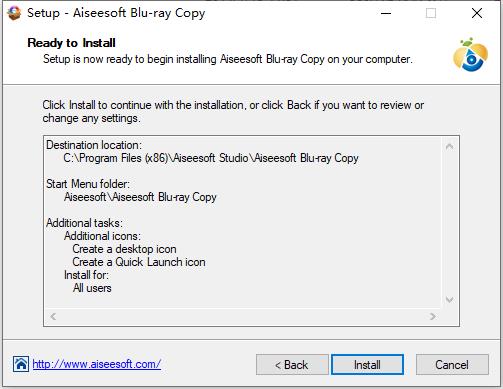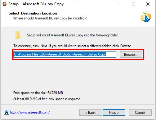 3、选择安装位置,用户可以选择默认的安装路径C:\Program Files (x86)\Aiseesoft Studio\Aiseesoft Blu-ray Copy,也可以自定义。