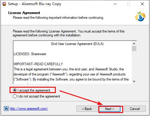 2、进入Aiseesoft Blu-ray Copy安装向导,阅读许可协议,勾选【I accept...】的选项,再进入下一步的安装。