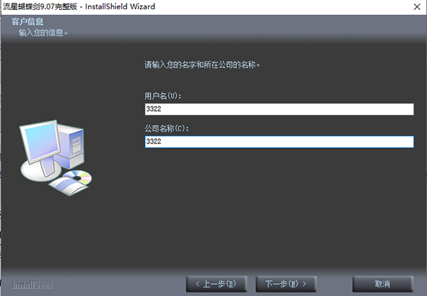 6、这里的用户名和公司名称可以随便填,这是单机版的,填好后点击下一步;