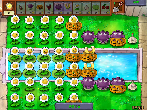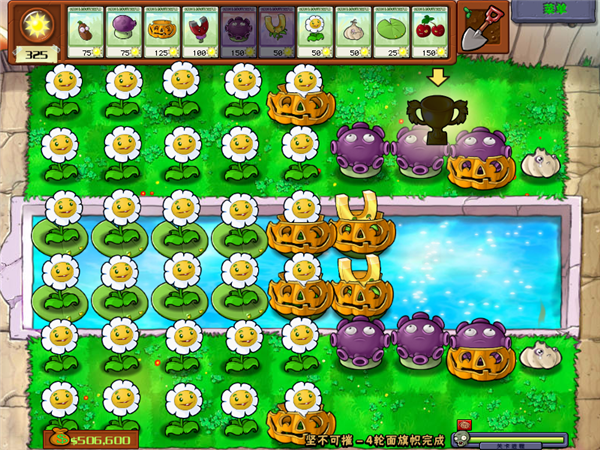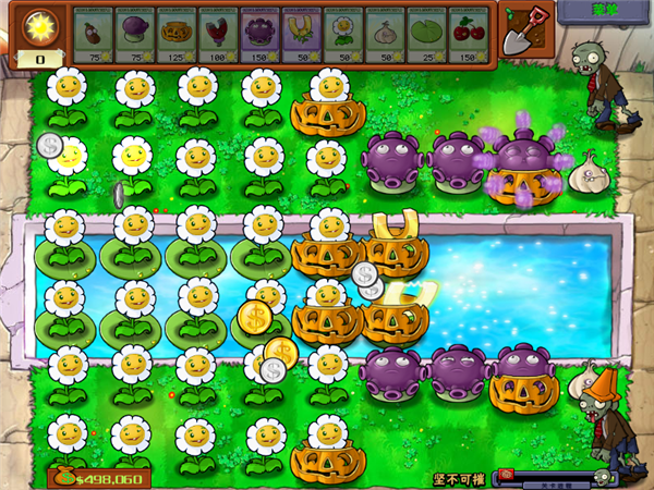 水池有海豚僵尸,所以放两排南瓜罩,一颗金盏花捡不过来所以放两颗,摆成这个阵容就可以坐等收钱了,每次过关补一下被咬坏的洋葱和南瓜罩即可。
