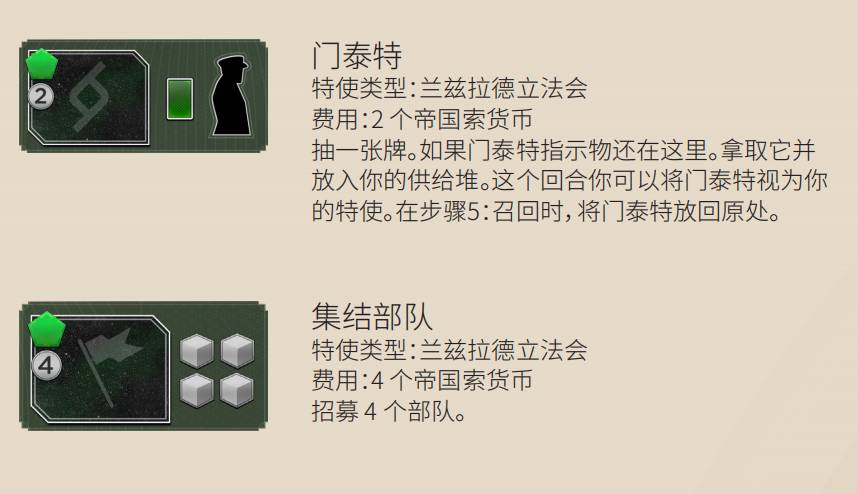 通常情况下,门泰特地区可能是最优的选择,基本上每个回合都无脑抢这里就完了。它让你可以仅仅花费 2 个帝国索货币就可以抽两张牌。并且还不影响原本的特使派遣次数。