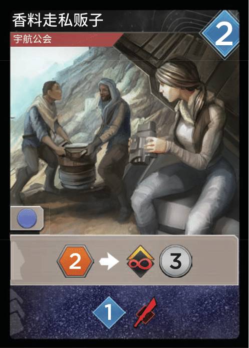 2、玩家行动:由本回合有起始玩家标志(一个画着大沙虫的圆片片)的玩家开始行动,打出一张手牌并置于领袖牌上方,派遣一个工人去打出的牌上所画图标对应的地区,支付地区所需的费用(若有),获得地区和卡牌带来的收益。如果无法支付地区所需的费用,或者要去的地区上面已有被派遣的工人,那都是不能去的哦(除非意外的出现了什么意外)。起始玩家行动过后,即完成了他本回合的第一个行动轮,然后轮到他顺指针方向的下一位玩家执行如上的行动。每位玩家依次轮流行动,直到轮到某位玩家时,他选择结算,则他在结算后便结束他本回合的所有行动。