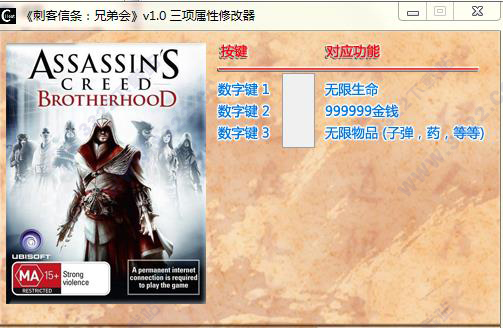 为了满足更多玩家的需求,本次小编带来了刺客信条兄弟会三项修改器,这是由大神风灵月影根据同名游戏制作的一个三项修改器,它能够为你修改游戏内的属性和物品等,比如让你变成无限生命,让有着无限的金钱,让你身上所有的物品都变成99999等等,玩家可以在游戏内大肆挥霍,所向披靡,感受更加畅快的游戏体验!需要的朋友快来下载吧!