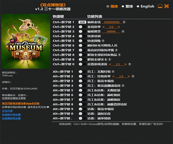 双点博物馆修改器是一款强大游戏辅助工具,专为模拟经营游戏《双点博物馆》量身打造。它集成二十一项实用修改功能,包括资源无限化,能一键解锁无限资金、使玩家满意度全满、文物展品瞬间补货;经营自动化,员工永不疲劳,自动满足玩家需求;建造加速,展览区即时建造升级、科技研究秒完成。适用于新手降低经营压力专注创意,速通玩家快速解锁内容,以及想自由实验布局的玩家。建议修改前备份存档。玩家开启所需作弊项即可畅玩,摆脱经营束缚,轻松打造顶级博物馆,尽情享受创造独特博物馆的乐趣 。
