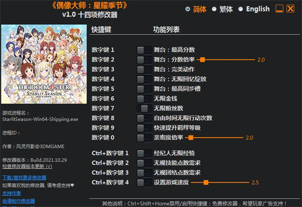 而本站提供的偶像大师璀璨之季修改器可让玩家获得更好的游戏体验,它包括最高分数、分数倍率、完美动作、无限回忆绽放、最高同步槽、无限金钱、无限粉丝数、自由时间无限行动次数、快速提升羁绊等级、亲密度倍率等十四项功能!有需要的玩家可下载一试。