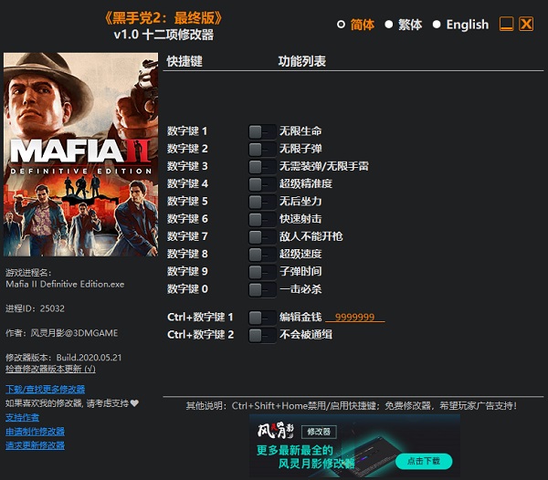 黑手党2最终版修改器是由风灵月影根据《黑手党2最终版》电脑游戏制作并推出的一款游戏修改器,玩家使用这款修改器能够修改无需装弹/无限手雷、编辑金钱、超级精准度、无限生命等数值或属性,使其可以有效的降低游的难度,让玩家们的游戏体验大幅提升。有需要的玩家欢迎下载体验。