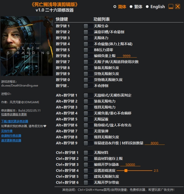 死亡搁浅导剪版修改器是一款专为开放世界动作冒险游戏《死亡搁浅导演剪辑版》所打造的多功能修改器,修改器有着无限生命、无限体力、无限子弹、满意识槽、无限体力、BB压力清零、无敌模式、无视负重、载具无限耐久度等修改功能,可大幅降低游戏难度,提高游戏的可玩性。