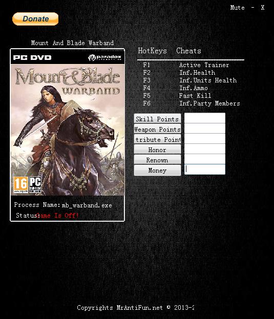 1、程序免安装,用户只需双击“Mount & Blade Warband V1.167 Trainer +8 MrAntiFun.EXE”即可打开修改器2、运行骑马与砍杀战团游戏,然后点击F1激活修改器,然后点击相应的热键即可实现某项功能,如按F2即可实现无限生命