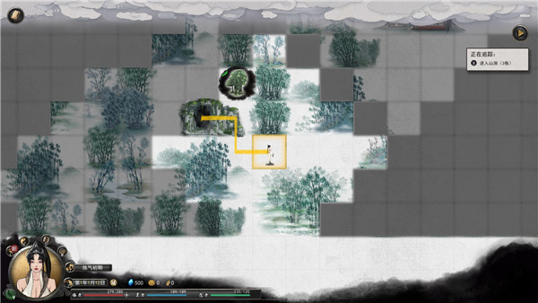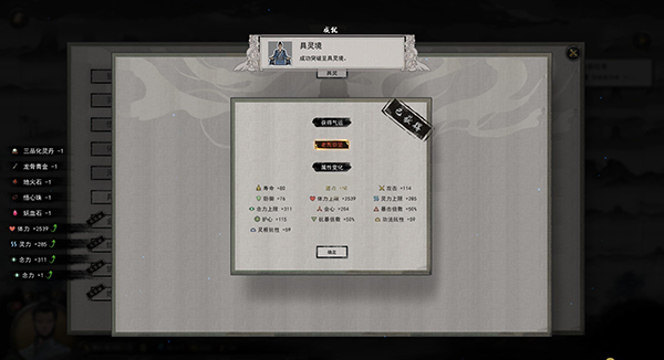 画面左下方显示的是游戏各项菜单的快捷按钮、当前的后天气运、境界阶段、时间、金钱资源、体力、灵力等基础属性。