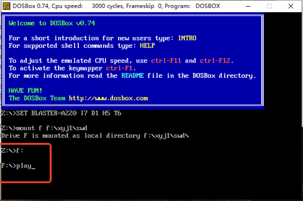 4、接下来再次输入f:(软件目录盘),敲回车,然后输入play即可运行游戏。