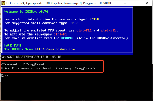3、首先输入mount f f:\xyj1\swd(f为软件目录盘,放在c盘同理),然后敲回车。