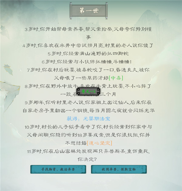 根据本世的修炼境界高低玩家可携带数件宝物以及继承数个命格(各种特殊加成)进入下一世。同样,转世后将重新经历新的随机事件,得到新的修仙体质以及属性。倘若运气好进入修仙世家,在该周目的修仙路途将会更加顺利。