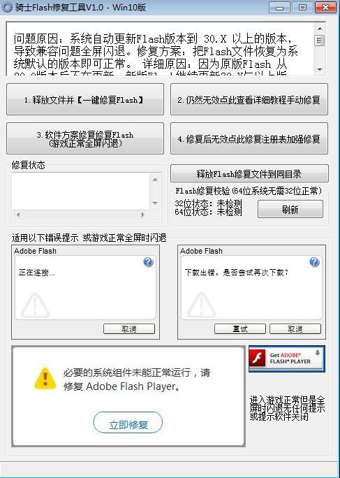 问题原因:由于最新版Flash插件兼容问题导致全屏游戏闪退,现主流浏览器Flash插件都停留在29.0最后版本,出现问题可使用此工具把系统内Flash修复并恢复至初始自带版本