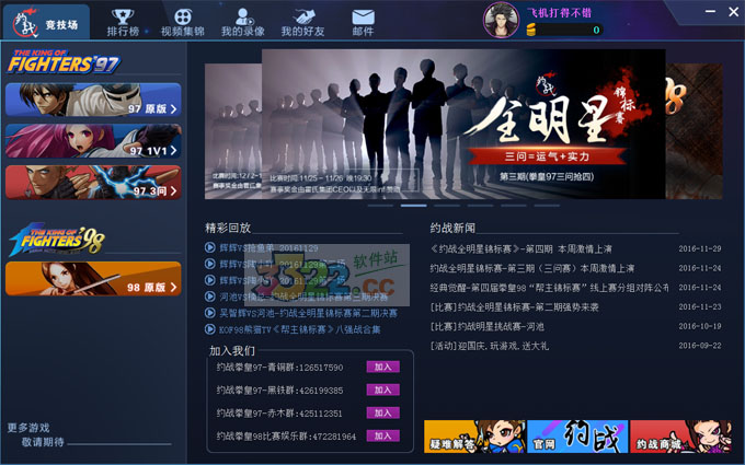约战竞技场首批竞技格斗游戏包括有《拳皇97》、《拳皇98》和《街霸方块》,无论哪一款都可以即下即玩。