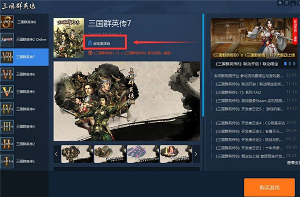 4、在右侧的游戏页面中,点击【绑定激活码】,输入您所获得的游戏激活码并点击确定按钮;