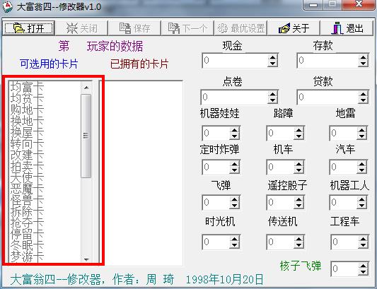 大富翁4修改器专业应用于大富翁4的辅助工具,支持修改现金、存款、点券和贷款的金额,并可自定义机器娃娃、路障、地雷、定时炸弹、机车、汽车、飞弹、遥控股子、机器工人、时光机、传送机和工程车等属性,可以说大富翁4修改器的存在绝对可让玩家更好的进行游戏的玩乐。大富翁4是由大宇资讯开发的一款多人联机模拟经营类游戏,于2000年发行。本作采用了640×480分辨率、HI-COLOR(65536色)高解析度、高彩显示模式。玩家可控制不同的人物,通过房地产、股票等多种商业形式赚取资金,并使用特殊的卡片和道具获得更多利益。大富翁4为了兼顾游戏运行的流畅与画面精致,《大富翁4》甚至把以往的3D即时贴图以顺序性3D图像代替,使玩家感到耳目一新。此外,行走路线设计摒弃了原来中规中矩的四方型,改为45度俯角视窗,通过八组可转动的镜头视角,可以一览丰富多彩的画面。与以往的《大富翁》不同,在第四代中有一个创新的做法:众位玩家可以在游戏开始时,自行设定不同的规则,伴随着不同的规则,会面临不同的挑战。由于完全开放的操作设定大大提高了游戏的弹性,尤其是在多人联线时,可以根据玩家的喜好,变化出多种不同的玩法,更有一番不同的乐趣。另外,大富翁4的场景横跨中国台湾、中国大陆、日本、美国四地,各式各样的绚丽风景和特殊事件层出不穷,令人目不暇接。就游戏内容而言,《大富翁4》仍旧以土地建设和房地产经营为核心,但与前三代相比则更复杂多样,更需头脑;投资方面则有股市交易、房地产炒作、企业股东分红等不同手段;更有30张功能独特的策略卡片,附之以特殊道具、各式买卖等等。