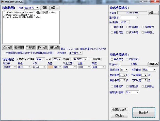 3、在这里玩家可先选择星际的地图,并可自定义“添加地图”,同时玩家还可自定义AI难度、血量、出生位置等内容,并且用户还可自定义显示时间、资源共享、特殊组队等功能