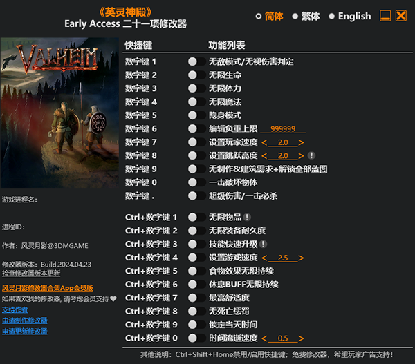 Valheim英灵神殿修改器是一款专为《英灵神殿》游戏所打造的多功能修改器,拥有丰富的修改功能,包括无限生命、隐身模式、无敌模式、一击必杀、制作无需求、设置玩家速度等等,可以降低游戏难度,让您的游戏变得更加的附有乐趣!