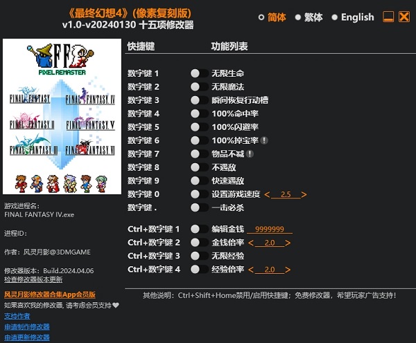 最终幻想4像素复刻版修改器是一款专为日式角色扮演游戏《最终幻想4-像素复刻版》所打造的多功能修改器,目前最高支持的十五项热键功能修改,包括无限生命、100%命中率、100%闪避率、物品不减、一击必杀等修改功能,且修改器简单易用,玩家只需启动游戏、开启修改器即可进行修改。