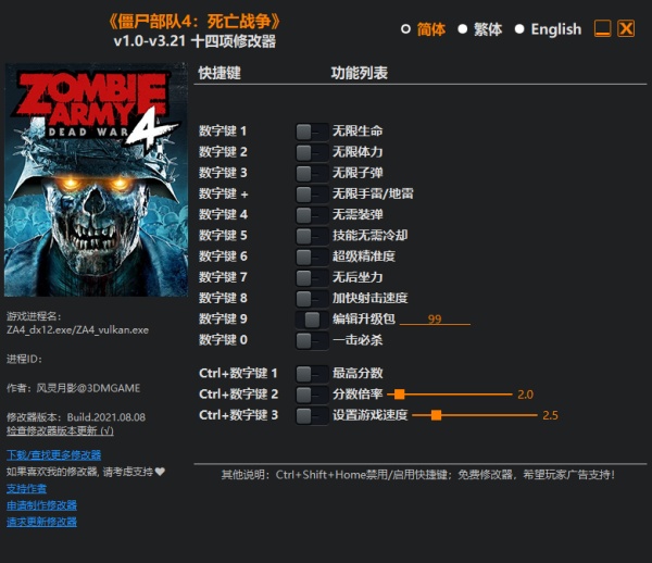 3、“无限子弹”会让手雷和地雷显示999,但实际并不影响手雷和地雷的数量,如果需要无限手雷/地雷请用“无限手雷/地雷”功能。