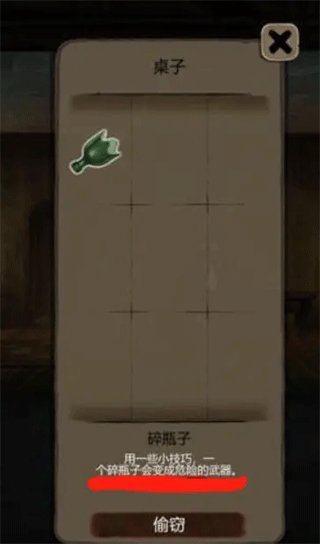 在电话右侧的桌子上搜寻找到破碎的酒瓶,收集到雅各布危险的特性。