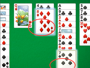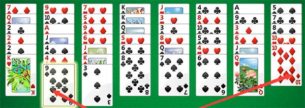 从列到列(或从可用单元到列)。在列中必须按降序依次放牌,而且红黑花色交替。