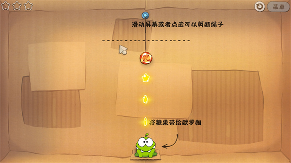 割绳子电脑版,英文名叫Cut the Rope。这是一款益智闯关游戏,游戏采用触摸屏操作方式,玩家需要根据不同的情况切断绑着糖果的绳子,或者用喷气装置、点破气泡等操作让糖果掉入宠物奥姆的嘴中。需要注意的是游戏中的昆虫,它们会通过绳子爬过来抢夺奥姆的糖果,若是被抢了,关卡就会宣告失败。