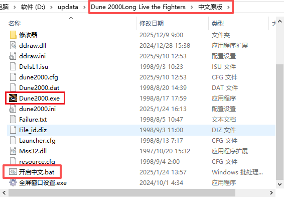 1、注意屏幕上方路径,选择“中文原版”,随后点击屏幕下方的“开启中文”文件,再点击“Dune2000.exe”启动游戏。