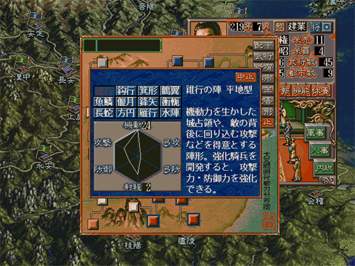 锥行阵攻击力+4、防御力+4。突击时有25%几率使对方混乱(不限阵型、地形)(需要60体力)。