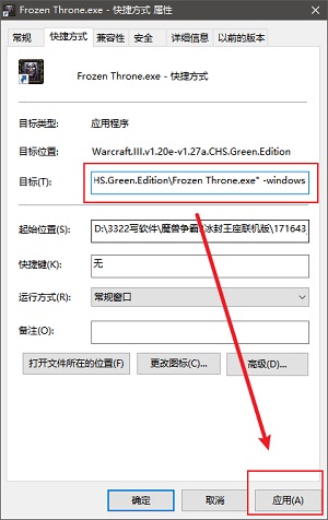 3、在目标后面插入“空格“+“-windows”,然后点击应用。