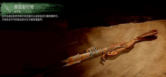 这是玩家在游戏中获得的第一把射钉枪,也是15级之前非常好用的武器。扔出的射钉枪会扎在敌人身上之后爆炸,在完全开弓的情况下还能穿透敌人盔甲。升满三级之后射击枪伤害可达135点,可以说是游戏早期杀怪越货的必备良品。