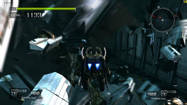 这部VS还配备了远距离瞄准功能,打起来比较棘手。因为我方的VS只要被炮弹击中3发,估计VS就得完蛋,而没有VS的话,敌人的攻击只要打正了,就是一招毙命。本作其实存在着一个类似《生化危机4》系列的BUG。在登录和离开VS的时候,不论VS还是主角都不会被攻击到,所以攻击无视。不知道是制作人故意呢,还是怎么着……总之,在这种战斗下,是需要合理应用这个BUG的。