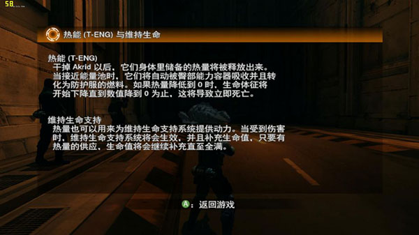 注意点:多利用Thermal Energy,他能给你的PDA输入地图,引导你方向,并且给予补充第一关其实和DEMO一模一样就是武器没有DEMO那么丰富,过去看见两个Akrid-Sepia(就是最先看见的那种Akrid,进攻方式就是扑过来),扫清。看到Sepia的位置不要拐弯,直着看过去有个半圆的徽章,地上有架VS,之后你会遇到体积巨大,凶狠好战的Akrid-Chryatis