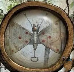 5、但是蝴蝶停下来时我根本抓不到蝴蝶,点一下道具画面右上角类似电灯泡的那个提示,他提示要把植物载到花盆里,推开左边的机器,正好有个空花盆,把先前在三个摇滚机器人那边得到的植物放入,最右边的花盆里有只丫型小棍子,拿着备用.再把左边那台有弹簧的机器对准刚载了植物的花盆,然后到画面右下角的开关处按下左边的开关,这时候经过光合作用,植物马上就长大了,开了一朵向日葵.过来摇动向日葵,可以得到瓜子,再把那个光合作用的仪器推到最右边的那个类似食人花的植物那再去开动开关,那个植物就活过来了,上楼拿小棍子撑住食人花的嘴巴,再点它可以从它肚子里拿出一个放大镜,放大镜正好观察蝴蝶身上的红点分布,我观察的是这样的,不知道红点是不是随机的。