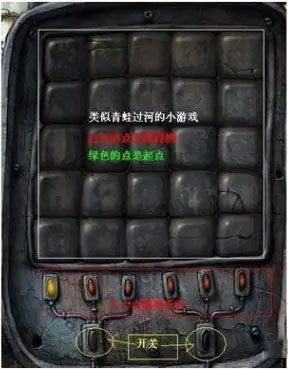 1、进到一个温室里,下来可以拿到身后的两个抽屉,室内有两台机器(左边的裹有弹簧状的机器,暂时不知道是什么东西,只看到地下接着一根很长的线,可能是产生光合作用的机器?右边的机器类似幻灯机)这台机器都连接着画面最右下角的一个配电盒,点击配电盒,又是个小游戏。这个小游戏的规则就像是青蛙过河,你可以一开始设定一个起点,然后走完全部的格子才算完成.但是又不像青蛙过河那样可以让你一步步的走,这里只能让你选择一个方向,然后电脑帮你走到这个方向的尽头,看图便知。