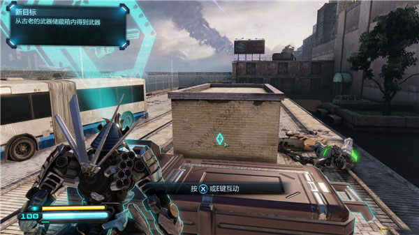 走上左侧的斜坡,去到大厦的边缘往下俯瞰,可以看见下方有三个狂派机械人在安装一把中子突击步枪,跳下以后,按一下RB键使用剑冲技能快速杀掉三名目标,然后按住X键拿取中子突击步枪。