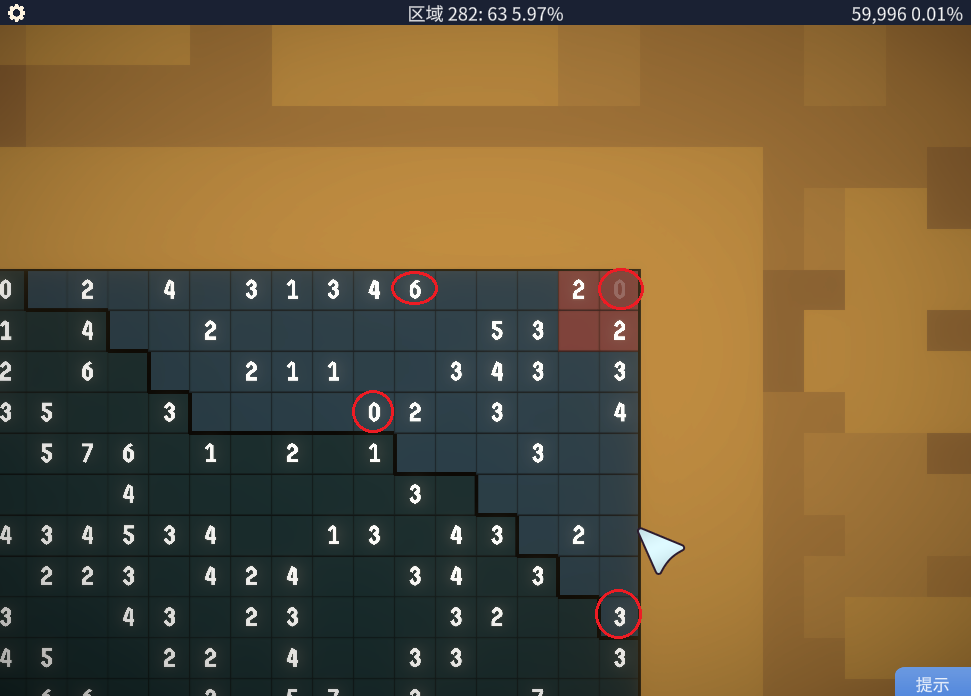 4、游戏中的每个数字代表周围格子包括数字本身格子一共九个格子的亮色数量(鼠标左键标记),其余皆标记为暗色(鼠标右键标记),其余及需要找到关键数字,比如“0”,“9”,还有边缘处的“6”等等。