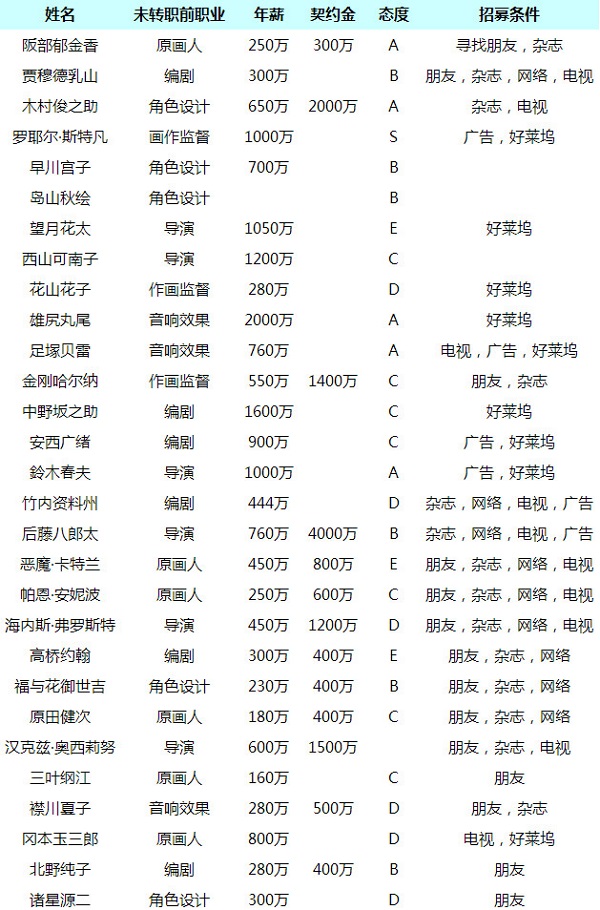 6.职员的职业有原画和脚本担当等职业,不同的职业监督出的动画数值倾向也会变化,教育时会发现新的内容哦。