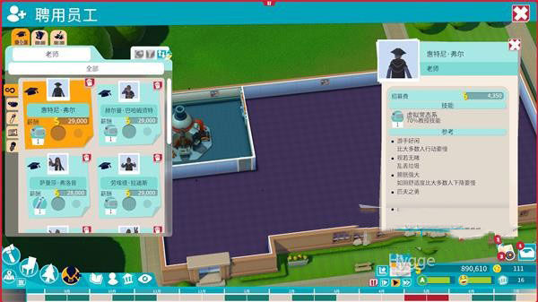 老师、助理和勤杂工都有自己独特的技能,每个人会随机拥有1~3个技能,技能越多,每个月需要付给他的薪酬就越多,这样会增加不必要的支出。每个教职工每次只能干一件事,尽管他有很多技能但也无法同时生效,所以每次要招募教职工时,尽量不要把钱浪费到有多个技能的人身上,只招募专业人士即可,能省一点是一点。