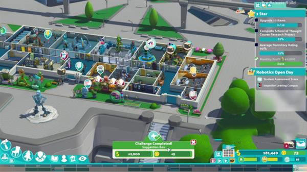 研究可以升级校园内的各种设施,完成所有设施的升级后,可以选择研究金钱或赞誉。每次完成研究目标时甚至可以获得高额奖励,而且这些研究目标会不断出现,及时完成就可以获得大量金钱。建造并升级研究实验室,招募3个有研究相关技能的教职工放进去,这样就可以快速且连续地完成研究目标,赚得盆满钵满。