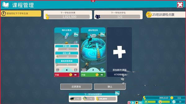 开设课程是最赚钱的手段,一是课程本身就可以带来很多学费收入;二是学生最终的学习成绩会影响到月度利润和XP收入奖励,学生的成绩越高,玩家的收入就越高。如果校园的课程稀少,且等级不高,那么就不会有人来你的学校就读,最后也赚不到钱。开设/升级课程需要花费“课程培训点数”,虽然成本比较高,但绝对会带来丰厚的回报。