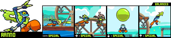 解毒堆叠:Ranno的Specials Strong Attacks和Jab Combo对他的对手施加最多4个有毒堆叠。这些堆叠攻击时会伤害对手,可以通过击中Ranno将其移除。