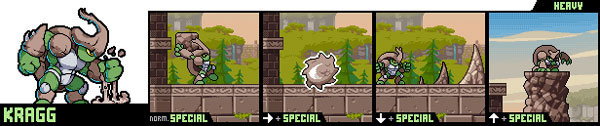 ROCK HURL:克拉格可以将一块岩石拉出地面并向对手投掷。离开他的手后,岩石变成了坚固的舞台,克拉格或其他玩家都可以打破。