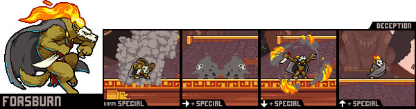 消费/争斗:通过使用他的羽绒特惠,Forsburn可以将烟云消散回体内。消耗了三朵云之后,Forsburn被充电,可以再次使用Down Special燃烧:将对手高速击倒。