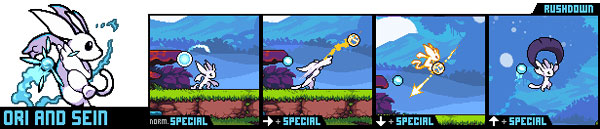 精神火焰:塞恩跟随奥利来到战场上。 Ori可以轻按Neutral Special,让Sein可以从Sein的任何地方迅速发射烈焰。 Ori可以持有Neutral Special以让Sein使用带电火焰。
