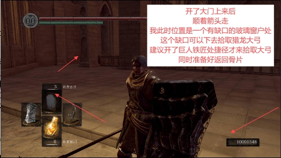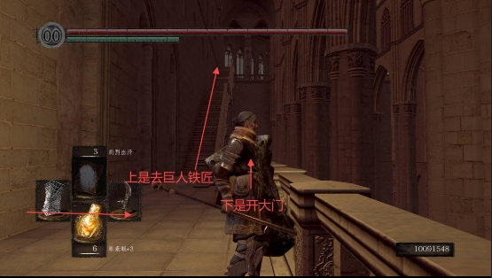 这里的大盾士兵会有仇恨,我们可以无视直接右转进小门,左侧巨人铁匠捷径后面再开。